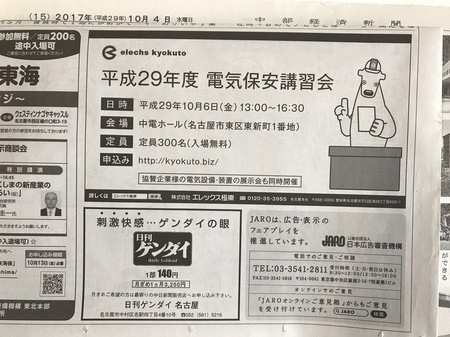 2017年10月10日 中部経済新聞に掲載されました 【電気保安講習会】 10月7日(土)付の中部経済新聞に、10月6日(金)に行われた 弊社主催「電気保安講習会」の記事が掲載されました。 前の記事 次の記事